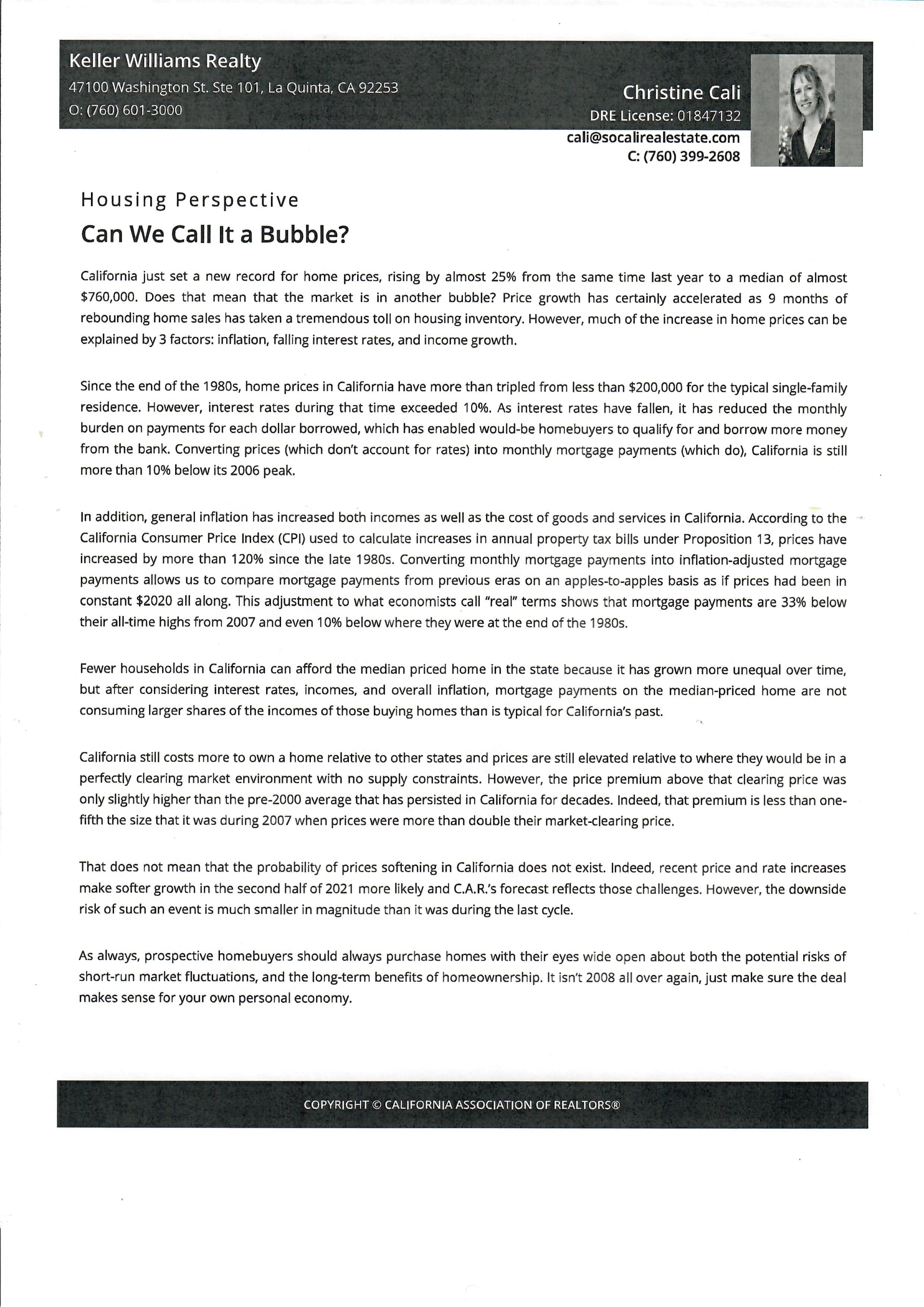 The attached article written by the California Association of Realtors, May 2021 highlights better than I why we are not in the same situation. For a dismal trip down memory lane, "The Big Short" is an excellent movie explaining how we got into trouble in the first place leading to "The Great Recession". Movies "Inside Job", "Margin Call", "99 Homes" and "Queen of Versailles" round out the story of greed, corruption, and horrific losses. Worth repeating, all indicators are that our current rapid real estate price gains are not driven by the same economic factors as before, thus, there is no prediction of an implosion. While we likely agree this appreciation cannot keep at its currently frantic pace, prices are highly unlikely to drastically plummet.